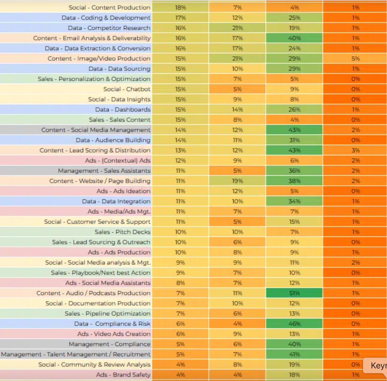 Org’s are finding the low hanging fruit. MarTech’s top 50 genAI use cases in marketing is useful - the usual suspects of content creation, production and ideation up top with ad-related use cases struggling to gain traction. Left to right: Usage daily-weekly; monthly; not tried yet; no longer using. Click the image to go to the full infographic.
